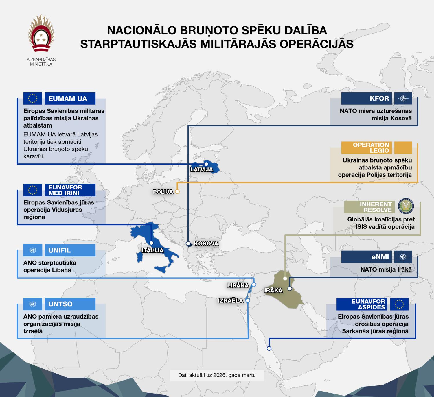 Šobrīd Latvijas bruņoto spēku karavīri pilda dienesta pienākumus šādās starptautiskās militārās operācijās un misijās: